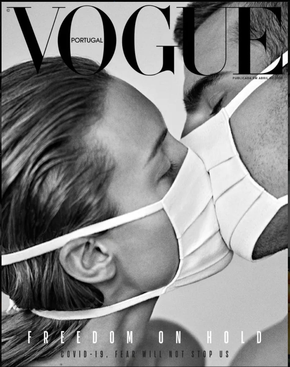 “Nothing should get in the way of true love”? No, what that caption should say is: “Nothing can get in the way of imbecility (if people have been scared enough).” That imbecility is also evident—again—among those (Democratic) politicians, “health” authorities and press outlets which all together spread that Big Lie (not concerning masks alone, but “COVID” overall) in 2020.
