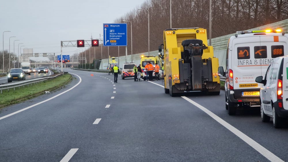 A truck ended up in the crash barrier on the A7 before Hoorn this morning around 8.45 am. The driver of the truck may have become unwell and died. Many emergency services responded to the report. The air ambulance landed on the road surface. A police spokesperson said the driver has sadly passed away. The incident caused a short traffic jam because the truck also had to be towed away.