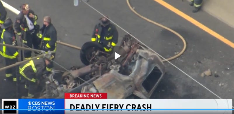 Boston, MA - A driver was killed in a horrifying crash in Boston Wednesday morning as their burning SUV smashed through a chain link fence and fell 40 feet onto a road below. It happened around 10 a.m. in Widett Circle near Interstate 93. The car was on fire when it went through a fence on the Massachusetts Avenue connector and landed on the exit 16 off ramp from the expressway, according to Boston Fire Commissioner Paul Burke. "We're fortunate that there was no car underneath when it came down from the overpass, that it didn't hit another vehicle," Burke said, adding that "there's nothing left" of the SUV. The chief said they have not been able to determine if the driver was a man or a woman. No one else was in the SUV. There's no word yet on what caused the fire or the crash.