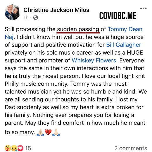 Philadelphia, PA - On November 22, 2022 Christine Jackson Milos reposted on her Facebook: "Shocked and saddened by the sudden loss of Tommy Dean Naj. Such a well-respected, fun-loving, talented musical teddy bear of a guy. He helped Whiskey Flowers immensely in the lone year we all got to know him. It is a big loss for the Philly music scene and all of the circles he traveled in. Will have a Maker’s and a lager in his honor. Keep the party rolling up there buddy!"