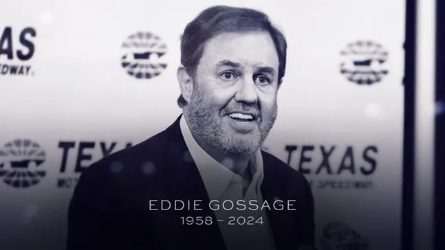 Concord, NC – Eddie Gossage, whose flair for promotion was a cornerstone from the time of construction of Texas Motor Speedway in 1995 through his retirement in 2021, died Thursday. He was 65. NASCAR Champion Tony Stewart said "Beyond shocked to learn of Eddie Gossage’s passing. The man was larger than life and one of THE biggest supporters of auto racing."