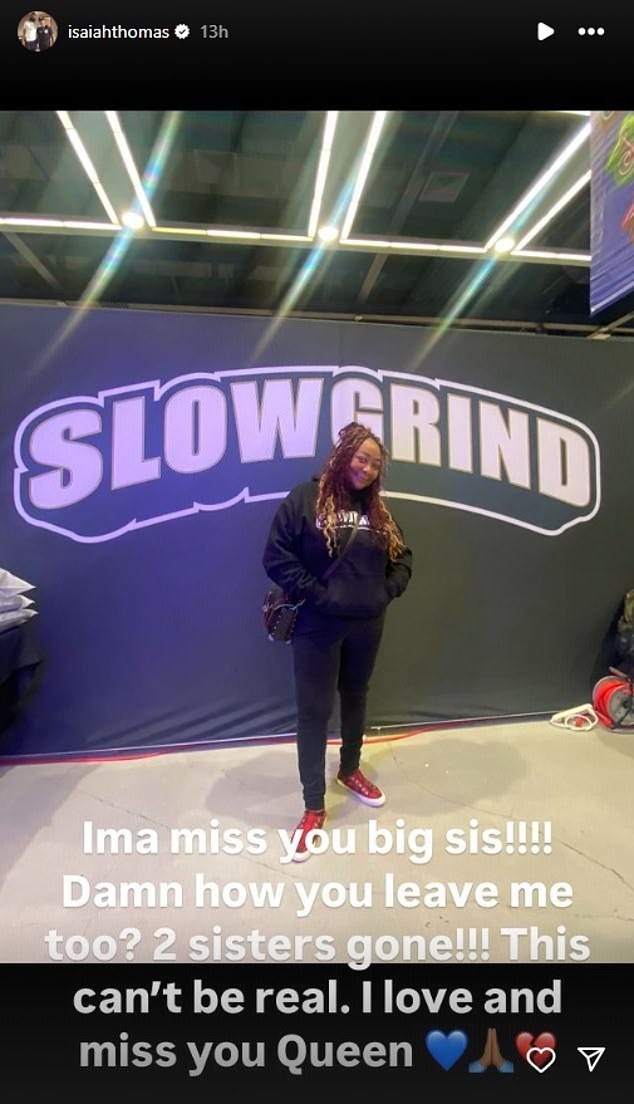 NBA star Isaiah Thomas is mourning the loss of his older sister after announcing her tragic death in a heartbreaking post on social media. Thomas, 35, wrote alongside a photo of late sister LaQuisha Baldtrip on Instagram: 'Ima miss you big sis!!!! Damn how you leave me too? 2 sisters gone!!! This can't be real. I love and miss you Queen.' The cause of LaQuisha's death is currently unknown. Thomas, who is on the Phoenix Suns' books, lost another of his sisters, Chyna, following a fatal car crash in Washington in April 2017.