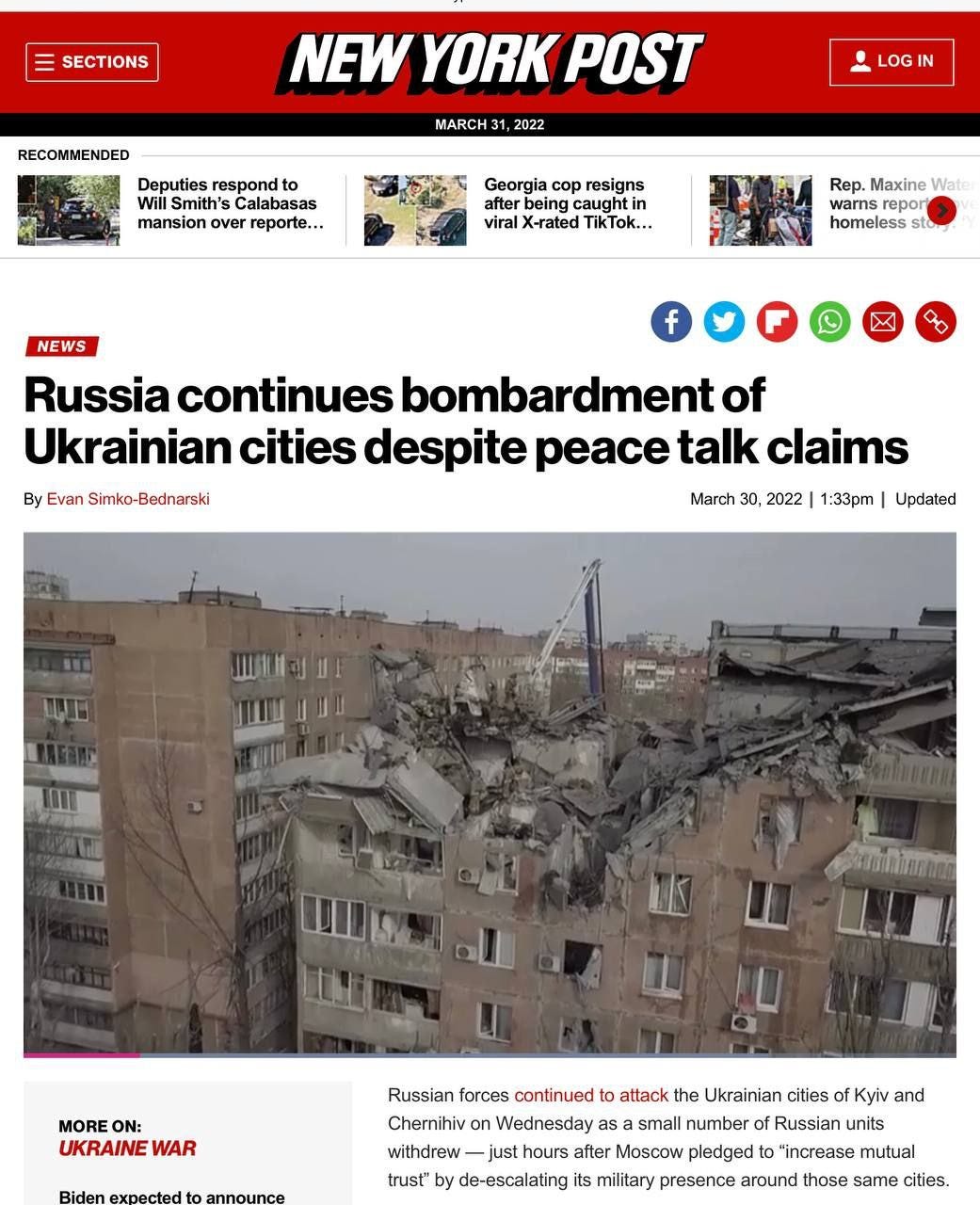 EXAMPLE #2 NEW YORK POST - "RUSSIA CONTINUES BOMBARDMENT OF UKRAINIAN CITIES"
