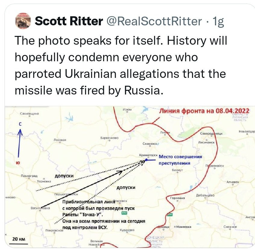 For a full listing of all the evidence that proves the missile, S/N Ш91579 was fired by the 19th Ukrainian Missile Brigade, based near Dobropolia, some 45 kilometers from Kramatorsk, see this excellent article by former US Marine officer and UN Weapons Expert Scott Ritter. There are plenty of other articles too, (HERE, HERE, and HERE) listing the proof and indications that it was a ukrop false flag attack on their own civilians. Such as the following:
