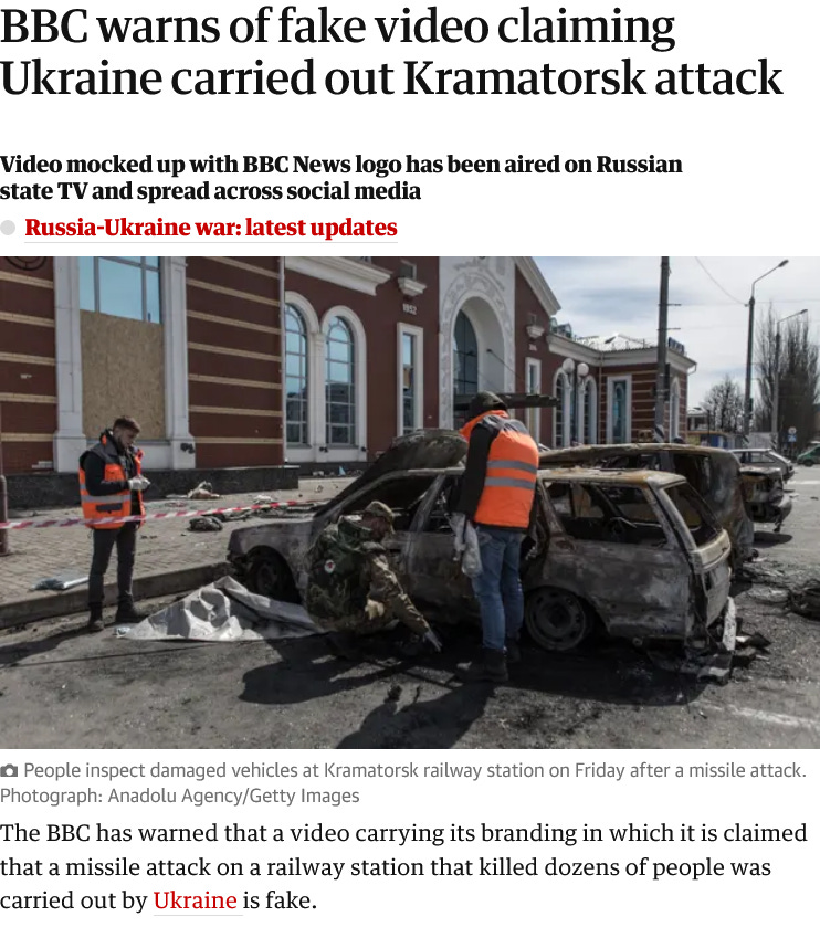 Thus, we see real, first-person, on the scene videos of the real aftermath of the Kramatorsk attack, video of the real S/N, all edited together, but with a fake BBC intro and logo added, and then spread all over the internet with the caption, "Look! The BBC finally told the truth for once!!!" So the professional liars can subsequently "debunk" the fake "BBC" vid, along with all the real facts the actual real videos contain. And then literally ALL Western propaganda outlets smear the story about the fake vid all over the web. The search phrase "BBC fake video missile Kramatorsk" brings back 55,000 links on Google, 24 million on Bing Search, and a whopping 25 million results on Yahoo Search. The Western propagandists claim the Russians added the fake BBC logo, but why would Russia discredit real proof of what happened by adding a fake BBC logo. The BBC has a well-earned reputation as one of the most mendacious media outlets in the world, their lies are legion. So why would Russia discredit itself and its own compelling evidence by adding a fake logo of known propagandists? Answer - they didn't.