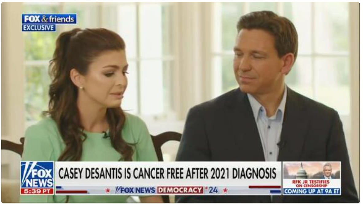 In a discussion about how her husband, Florida Governor Ron DeSantis, decided on running for president in 2024, Casey explained that “we both have this calling, and you probably know my story, right. About a year and a half ago, I didn’t know whether I was gonna see my kids graduate from kindergarten.”