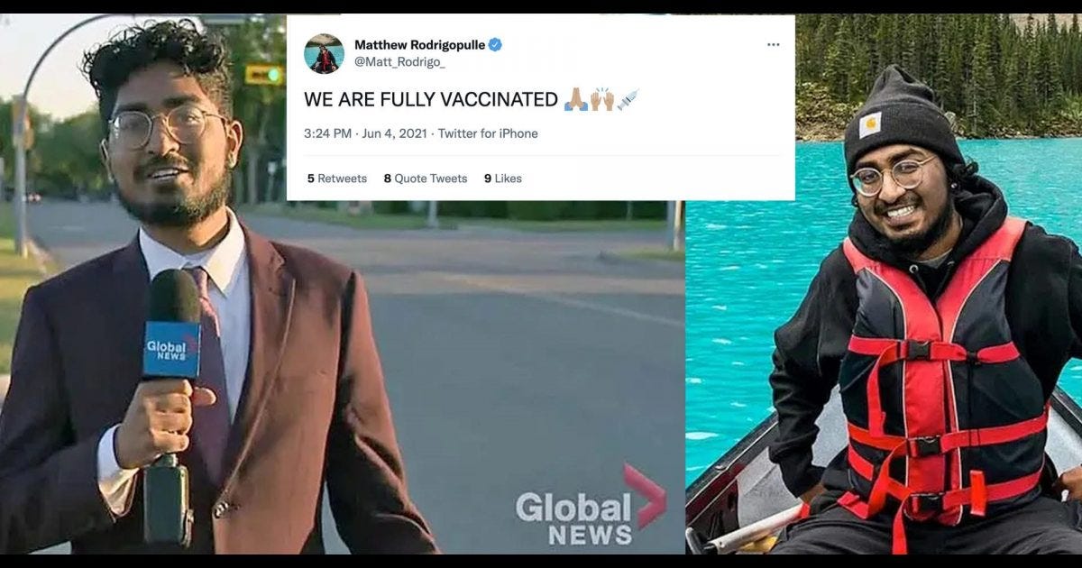 Rodrigopulle’s “vaccination” status, and his zeal, were reported by the Rair Foundation on Sept. 22, eleven days after our post on Global News Toronto’s mawkish take on his untimely death, the such “grief porn” in general.